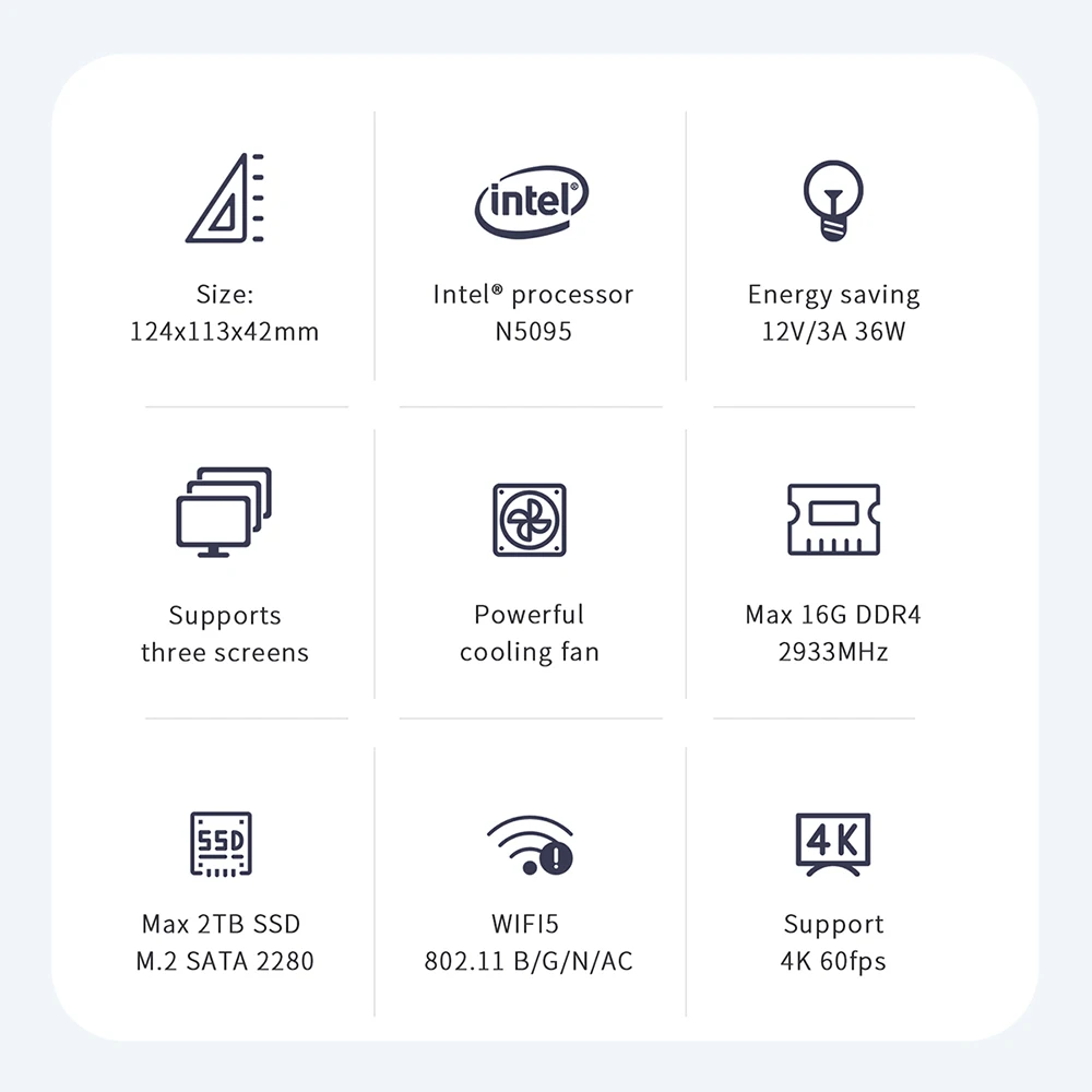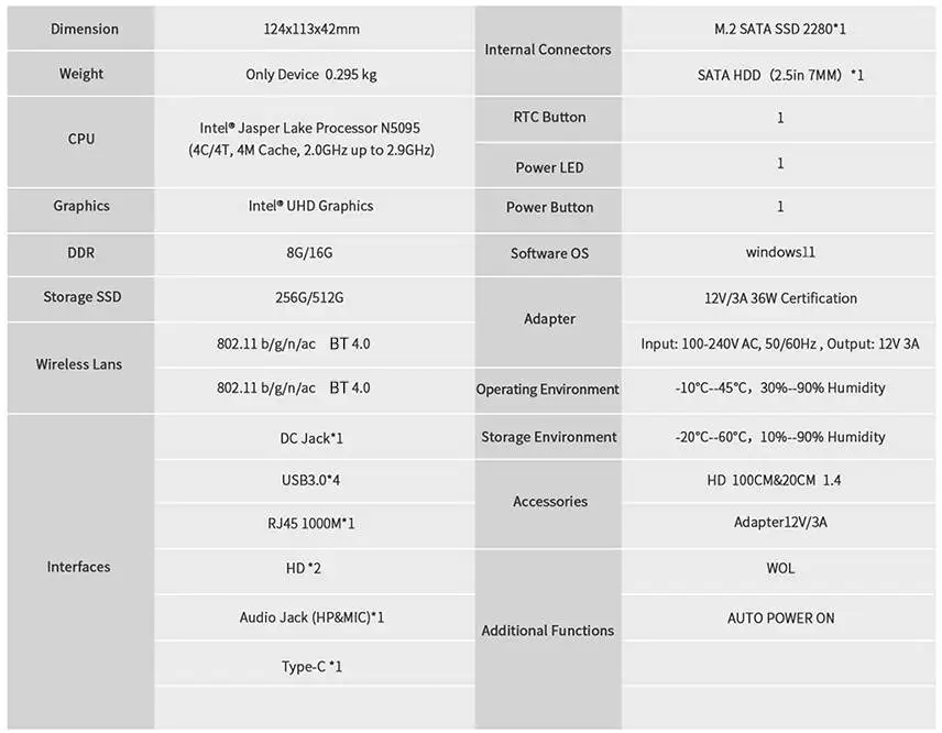 - CPU: Intel 11th Gen N5095 (4M Cache, 2.0GHz up to 2.9GHz)